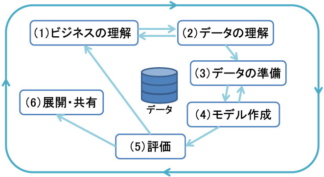 (1)から(6)のステップは一方通行ではなく、図3にあるように行ったり来たりを繰り返すことがCrisp-dmの特徴である。