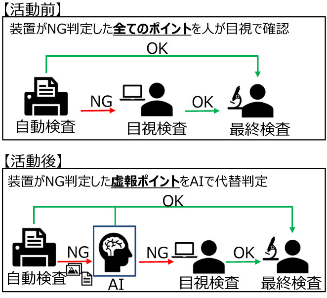 EMS工場では多種多様な電子基板を製造し、設計・キーコンポーネント・製造・評価・物流・保守をモノづくり総合サービスとして提供している。基板の外観検査は、基板のサイズにもよるが、検査点数は基板1枚あたり数千点以上に及ぶ。通常は自動検査装置で自動判定されて生産の効率化されているが最終的には人間の目視検査に頼らざる得ない部分がある。その一例として、自動検査装置がNGと判定しているが、実際に目視検査を実施するとOKである検査ポイントである。「虚報」と呼ばれる事象で、自動検査装置を使う上では避けられない問題である。虚報ポイントは本来目視検査が必要ない点であり、目視検査をすればするほど無駄が発生してしまう(図4)。