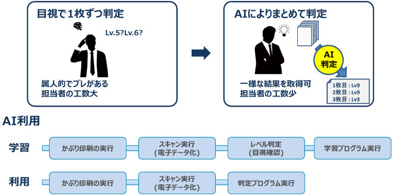 プリンターの設計・開発をする際に避けて通れないのが人間の目視による印刷物の官能評価である。印刷物の「美しさ」の評価は、色の濃淡や発色性など測色計などで定量化できるものがある一方で、定量化できない微妙な不具合が存在する。具体的には、帯状の色ムラ・筋状の色ムラ・不定形の色ムラなどで、数十の不具合に分割して人間の目で各不具合にレベルを付けて官能評価が必要である。これらの官能評価は、数百枚~数千枚の印刷物に対して行うことが通常であり、評価工数が膨大である。また、目視によるレベル付けは属人化しやすく評価者によってのレベルのばらつきが問題となる。
