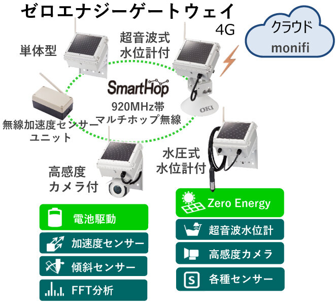 本製品では、OKI独自開発の高感度カメラモジュールを搭載し、暗所でも撮影可能である。また小型のソーラー発電パネルとバッテリーで連続不日照9日間の動作を実現し、雨天が続く天候であっても運用を継続することが可能である。さらに、本製品は、920MHz帯マルチホップ無線「SmartHop®(注1))」と4Gによる無線通信機能に対応し、既存製品の「ゼロエナジーゲートウェイ水位計付」や「無線加速度センサーユニット」を用いた構造物の加速度・傾き・固有振動数の計測と連携が可能となっている。また、OKIのクラウドサービス「インフラモニタリングソリューション(monifi®(注2))」との連携も実現している。システム構成概略を図1に示す。