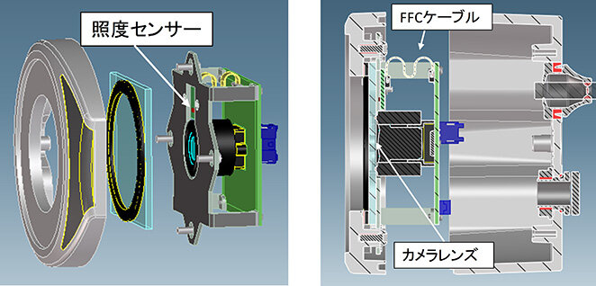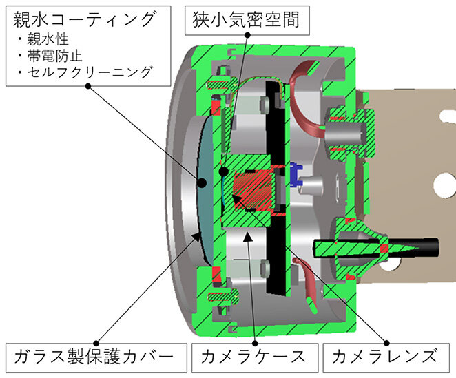 また、カメラモジュール内部も省電力を実現した回路構成のため、ほとんど発熱せず、熱を利用とした結露対策を構築することができない。そこで今回開発したZE-GW高感度カメラ付では、透明カバーに耐候性のある親水コーティングを施し、結露は水滴状にはならず画像への影響がほとんどないことを実現している。また帯電防止機能もっているため、外気に含まれている埃(ほこり)や塵(ちり)などが付着しにくく、さらに付着した場合でも降雨などにより流れ落ちるセルフクリーニング機能もっている。内部側は、ガラス製保護カバーとカメラレンズをゴム製のカメラケースで密着させ、狭小の気密空間を設けることで、結露しにくい構造として対策をしている(図4)。