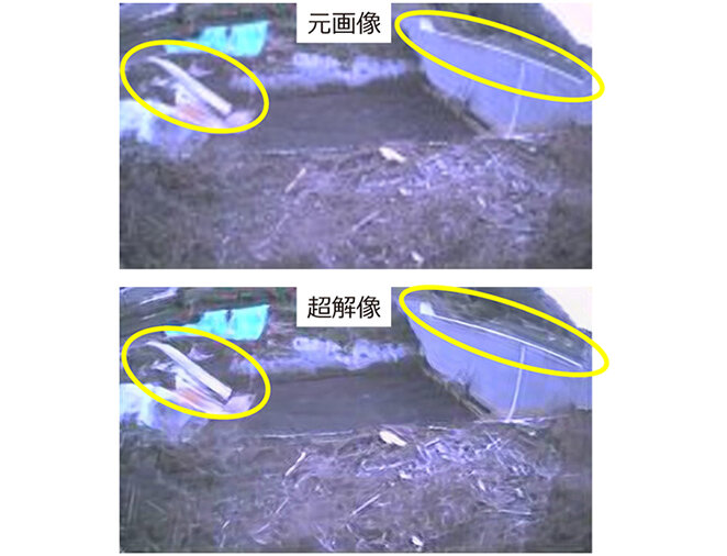 ZE-GW高感度カメラ付はクラウド側のインフラモニタリングプラットフォームと連携した超解像機能を備えている。消費電力を抑えたまま高頻度に撮影するために、あえて低解像度の画像を送信し、クラウド側での深層学習を利用した超解像処理を行うことで画質を向上可能である。図3に超解像処理による画質改善効果を示す。元画像では低解像度にしたために潰れてしまっている部分(図中楕円囲み部分)のエッジがシャープになって見やすい画像になっていることが分かる。