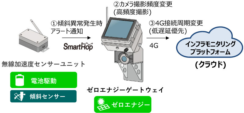 ZE-GW高感度カメラ付は加速度センサーユニットなどの外部センサーと連携した警戒モード切替機能を備えている。920MHz無線(SmartHop)で外部センサーである加速度センサーユニットが接続可能であり、加速度センサーユニットの傾斜などが予め設定した警戒レベルを超えると、SmartHop無線経由でZE-GWに警戒情報を通知する。ZE-GWは警戒情報を受け取るとカメラ撮影の頻度を高頻度に切り替えて、現場の状況の変化を逃さないように動作する。あわせて通常時は省電力化のために通信頻度抑えている4G通信を高頻度に切り替えてクラウド上のインフラモニタリングプラットフォームと通信する。こういった連携機能によって、ソーラーパネルや装置の小型サイズを維持したままで、通常時の低消費電力と緊急時の低遅延動作を実現している(図5)。