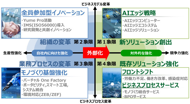OKIは、「組織の変革」「業務プロセスの変革」「新ソリューション創出」「既存ソリューションの強化」の4象限でお客様のDXに貢献するDX新戦略を策定しました(参考文献1)。