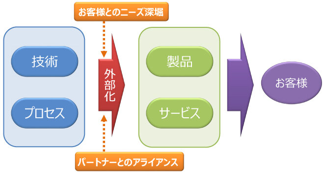 DX新戦略では、外部化(エクスターナライゼーション)モデルを提唱しています(図2)。これは、自社の技術・プロセスを強化して、ソリューション、プロダクト、サービスとしてお客様に提供することです。OKIの持つ技術やプロセスをコアに、顧客ニーズの深掘りとパートナーとのアライアンスを進め商品化に繋げます。