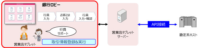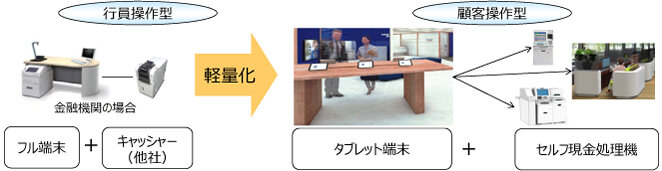 店舗の軽量化を図るために、多くの金融機関ではタブレット端末の導入を進めている。しかし、多くのタブレット端末は取引情報の入力までに留まり、金融機関ホストへの取引連携、サブシステムへのデータ連携などは、既設のホスト専用端末でオンライン取引を実行する仕組みとなっている。そのため、行員が実施しなければならない事務が残存し、完全にはセルフシフトできていない場合が多い。