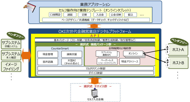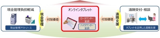 現在、OKIは現金処理のセルフシフトを促進するために、ハイカウンター業務(入出金、振込、定期入金など)を搭載したオンラインタブレットを開発中であり、業務テンプレートの充実化を図っている。
