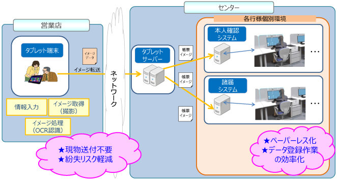 B銀行では、オンラインタブレット取引後、同オンラインタブレットで生成した帳票イメージデータを事務集中センターへ送信し、店頭で実施していたオペレーションを事務集中センターへ集約し、店頭事務の削減を図っている。また、センターの行員はオンラインタブレットから送信された帳票イメージデータを専用端末で読み取り、端末へ自動で取引内容の入力が可能となり、端末入力作業の効率化も実現している。