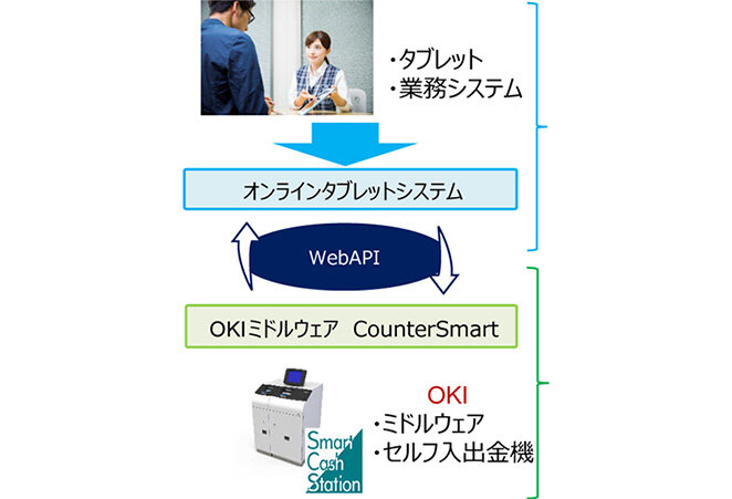 OKIはオンラインタブレットとセルフ現金処理機SmartCashStationを連携させることで、現金処理を含めた取引をお客様自身が実施し、行員の現金タッチレス運用を実現する(図6)。