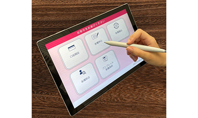 オンラインタブレットを導入している金融機関との共創により、セルフ操作向けの業務テンプレートを開発し、タブレットに搭載した。口座開設、諸届、定期性取引などのローカウンター業務をはじめ、入出金、振込、公金収納などのハイカウンター業務をテンプレート化し、セルフ操作が可能な画面レイアウトや画面フローを提供する。