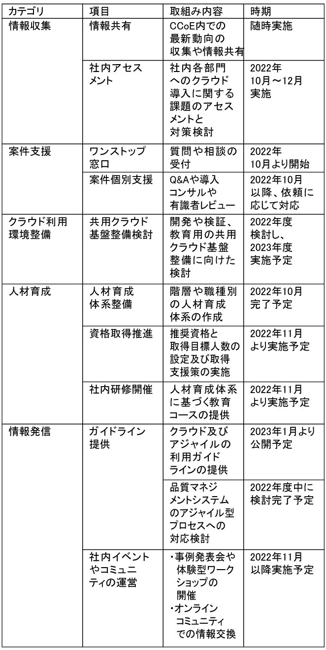 上記カテゴリの「情報収集」では、CCoE内でクラウドやアジャイルに関する最新動向の収集と共有を行うとともに、営業部門や事業部門、開発部門を中心に現場がどのような課題や要望を持っているかをアンケートや個別のヒアリングにより確認し、CCoEの活動計画に反映させる。「案件支援」、「人材育成」及び「情報発信」には、ヒアリング結果も反映しながら(2)節で説明したサービス提供を順次実行していく。「クラウド利用環境整備」では、現場が開発や仮説検証、技術習得などの目的で、より簡便な手続きで気軽に利用できる共用クラウド基盤の整備を検討する。