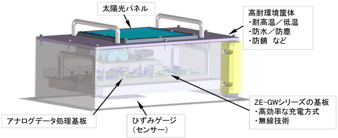 長期間の構造モニタリングを実現するには、長期の経年劣化に対応できる耐環境性能が必要である。さらに、ひずみセンサー部は船体の甲板部に設置されるため、日射による温度上昇や劣化、潮風や海水による劣化など、日常環境の屋外とは異なる厳しい環境にさらされる。本システムの開発には、このような厳しい環境に耐えられる高耐環境性筐体(きょうたい)の設計が必要となる。