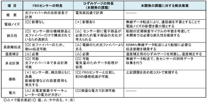 表2 ひずみゲージとFBGセンサーの特長及びひずみゲージの開発課題(一例)