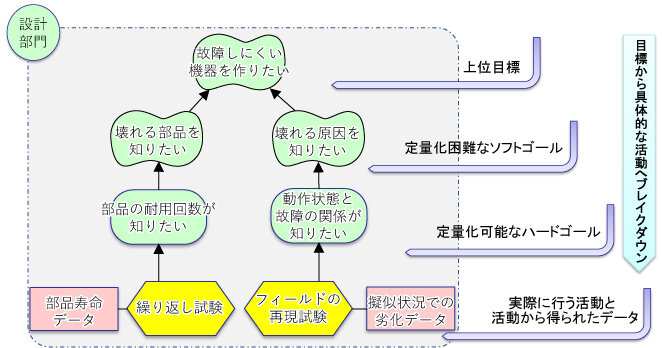 まず設計部門の現状(as-is)を模式化したものを、図2のように表現する。所望する状態を表す上位の目標は、定量化困難な目標(ソフトゴール)から定量化可能な目標(ハードゴール)へとブレイクダウンされ、部門で実行されたタスクに付随して得られたデータがその部門内で完結している。データ活用ゴールモデリングでは、この部門内にとどまっているデータを部門間で連携し、活用することが望ましい状態であると考える。