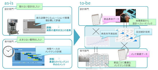 そこでデザインパターンの一つ、Mediatorパターンを導入することにより、AI技術を仲介とした部門間連携をあるべき姿(to-be)としてモデル化する。設計部門と保守部門のデータ連携を簡略化して表現したものが前節の図1である。この連携での各部門の現状(as-is)とあるべき姿(tobe)をイメージ図にしたものを図3に示す。図3左の現状(as-is)では、設計部門と保守部門が各々の目標に対して独立して活動していることを示している。つまり、設計部門は自部門の目標「壊れない設計をしたい」に対し、自部門でフィールドの再現を耐久試験やシミュレーションによって実施する必要がある。また保守部門は「止まらない運用をしたい」という目標に対し、実運用時間に基づく時間ベースのメンテナンス計画を実施している。それに対して図3右のあるべき姿(to-be)では、保守部門が保有する実際の現場で取得したメンテナンスデータを設計部門に提供している。これにより設計部門は実際のフィールドデータに基づいた設計ができる。同様に、設計部門が保有する部品ごとの寿命データを保守部門に提供することで、保守部門は部品の状態ベースの細やかなメンテナンス計画が実現できる。図1では図3のデータ連携の仲介役としてAI技術である時系列予測技術と記述統計技術が作用することによって双方の目標ゴールが適切に解決できることを示している。