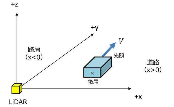 車両の先頭を「車両が移動する方向の前方である」と定義したとき、その対面側が後尾である。たとえば、LiDAR座標系を道路面(x-y面)に対し水平になるように設置したとき、走行方向と先頭と後尾の位置関係は図2のようになる。