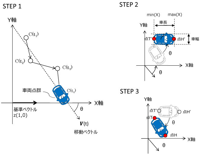 V(t)が基準ベクトルの+方向と一致するように、車両点群をθ[rad]だけ回転させる。このとき、車両点群のxの最大値が車両の先頭(点H’)、最小値が車両の後尾(点T’)となる。