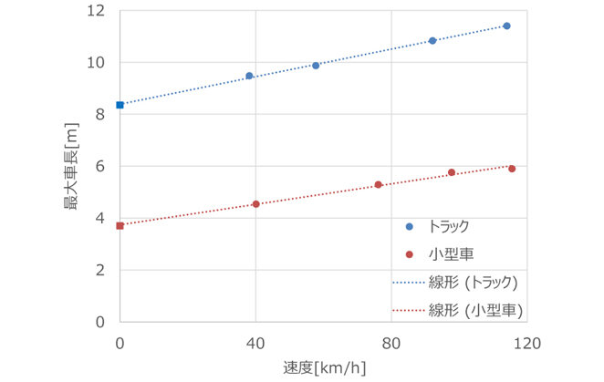上式によると、時速90kmで走行する8m長トラックをLiDARで計測すると、約2.5m伸びることになる。図6はLiDARで計測した車長の最大値と走行速度と関係をプロットしたものである。このとき、LiDARのフレームレートは10fpsである。なお、速度0[km/h]の値は、車両の仕様上の車長である。この図が示すように、スキャン式LiDARで計測された車長は、式(1)に従って伸びていくことが確認された。そのため、より高精度に車長を推定するために、計測車長を式(1)に従って補正することにした。