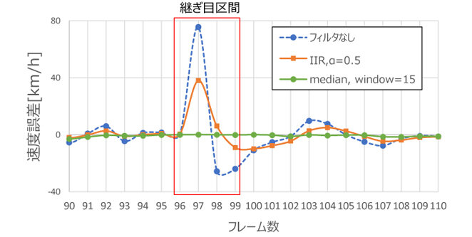 図8に、一定速度で走行させた車両の速度誤差を示す。車速の真値は、走行車に搭載したRTK-GPS測位システムを用いて、0.1s間隔で取得した。図8「フィルターなし」に示すように、瞬時的な速度では、継ぎ目区間で大きな誤差を生じることが分かった。