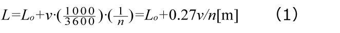 速度v[km/h]で走行する車両(車長Lo[m])をスキャンレートn[fps]のセンサーで計測したときに観測される疑似車長L[m]は、次式となると考えた。
