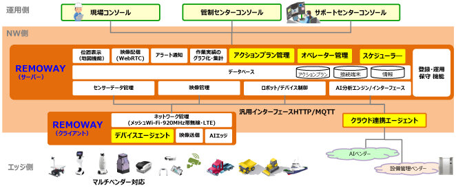 REMOWAYで特に注力する機能は、サーバー側ではアクションプラン管理、オペレーター管理、スケジューラー、クライアント側ではデバイスエージェントとクラウド連携エージェントである。これらの機能により、現場の業務特性に合わせて、現場の人とエッジデバイスを柔軟に連携させ、遠隔運用センターが現場状態をスケジュールに基づき、リアルタイムに遠隔運用するリモートDXを実現できる。