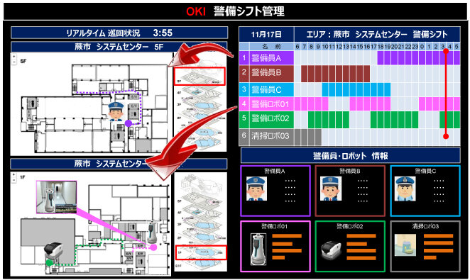 これにより、現場の人とエッジデバイスのリソース管理をベースにそれぞれの業務スケジュールを管理し、現場業務の見える化(施設内マップ、警備員の配置、異常場所など)、現場異常へのアクションプラン提示がシステム化される。たとえば巡回しているロボットの映像からしゃがみこんでいる人を発見し、アクションプランを遠隔から見ている隊長へ提示し、隊長は複数提示されたアクションプランから人への駆けつけや、しゃがみこんでいる人への声掛けなどの対処を選択するだけで実行できる。リモートDXによる管理業務の効率化が進むため、警備拠点は一か所だけでなく、複数拠点(N)へと拡大できる。