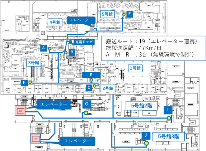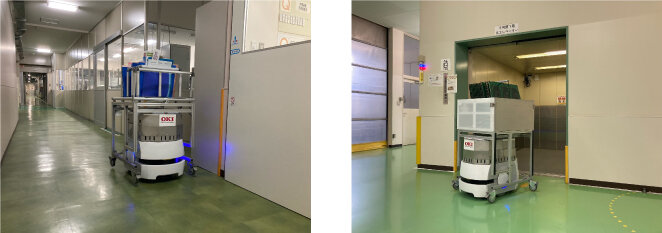 工場の別の階に移動する搬送にはAMRもエレベーターを使用する必要がある。エレベーターは専用機を新たに設置するには費用面、及びレイアウトからの制約を受けるため、既存機で人と共用することにした。