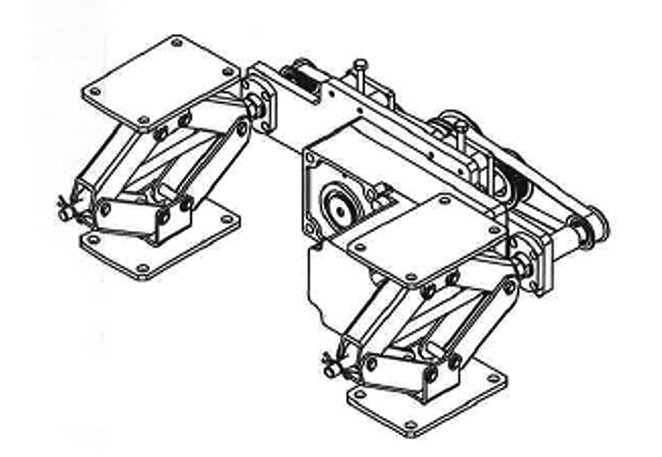 AMR自体の可搬重量は90kgで、そこから台車重量と昇降機構の重量を差し引いた分が製品の可搬重量となる。そのため、一度に多くの製品を搬送するためには昇降機は可能な限り軽量化しなければならない。同時に、AMRと台車の高さの関係で昇降部に使用できる空間を多く取れないため単純な機構かつ、重量物にも対応できる機構でなければいけない。そこで、自動車のタイヤ交換の際に使用されるようなパンタグラフジャッキの構造を採用した。図2にパンタグラフ構造を示す。