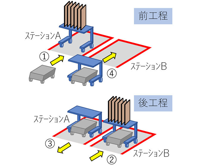 ③後工程のステーションAで空の台車を積載