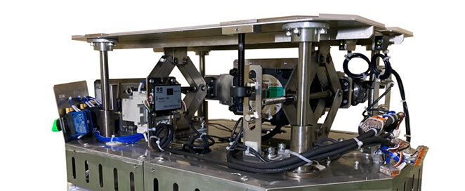 また、パンタグラフ式は収納性にも優れ設置スペースが少ないAMRにもマッチしている。それを前後に配置することで安定性を高めた昇降機構とした。結果、この機構の総重量は目標の20kg以内に収めることができた。写真3に実際のAMR上部に設置した昇降機構を示す。