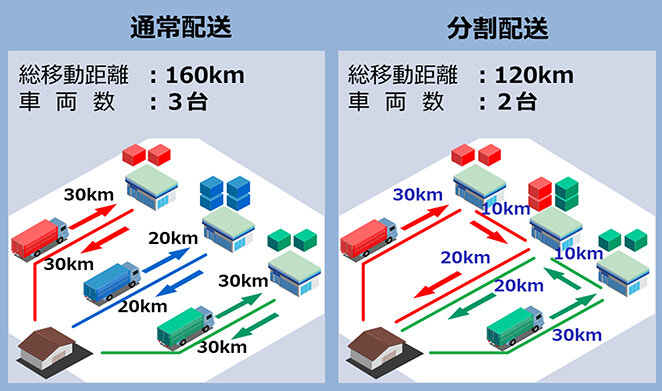 分割配送とは、ある配送先に2台以上の車両で荷物を運ぶ配送手段のことである。分割配送と、分割しない通常配送との違いを図2に示す。この例では車両の最大積載量は4個とし、三つある配送先へ配送すべき荷物数はそれぞれ2個、4個、2個、デポ及び配送先間の距離は図中に示した値とする。通常配送では三つの配送先それぞれに個別の車両が訪問して配送する。それに対し、分割配送では中央の配送先へ配送する荷物を2個ずつに分割し、2台の車両で配送できる。そうすることでより少ない車両数でより短い総走行距離の配送が期待できる。一方、分割配送ではどの配送先の荷物を分割するか、またどの比率で荷物を分割するかといった通常配送では現れない項目も考慮する必要があるため、配送計画立案が複雑になるというデメリットが生じる。この複雑な条件を加味した配送計画を人手で立案するのは困難であるため、機械的に計算する手法を確立することが課題となる。