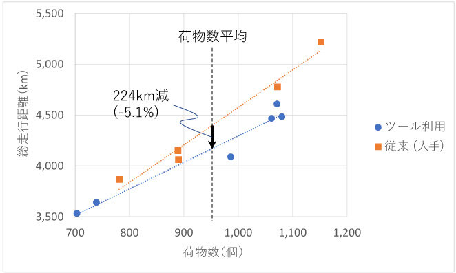 実験結果を図3に示す。図3は1回の配送で配る荷物の総数とその時の総走行距離の関係をプロットしたものである。荷物数は日々異なり、また総走行距離は荷物数に応じてほぼ線形に増加していることがわかる。今回の配送ルート最適化ツールを利用した場合、従来よりも総走行距離が短縮されていることがわかる。その効果の大きさは荷物数に依存し、荷物数が多いほど効果が高い傾向を示している。今回の実験では、荷物数の平均値は948個であった。この荷物数で代表させると、1回の配送当たりの今回と従来の総走行距離の差は平均して224km(従来総走行距離の5.1%相当)と見積もられる。この現場では年間通じて業務を行うので、年間に換算すると81,780kmに相当する。