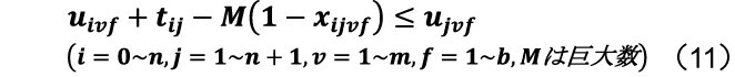 式(11)はある車両が連続して二つの配送先を訪れる場合、各々の到着時刻の差は配送先間の移動時間以上であることを示す。