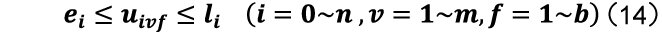 式(14)は配送先iの到着時刻がei以上li以下であることを示す。