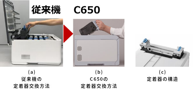 トップカバーを開けずに定着器を交換可能とすることで、従来機では40cmを必要とした装置上部空間のメンテナンススペース図1(a)を20cmに縮小した図1(b)。これを実現するために定着器は装置本体の外装も部分的に兼ねる構造とし図1(c)、用紙スタッカの一部を定着器で構成した。また消耗品として定着器ユニットを取り外す時には、定着器ユニットのハンドル操作に連動して定着器と装置本体の固定が外れ、そのままハンドルとして機能するように構成した。これらの新規構造によって机の下などの装置上方の空間が狭い場所であっても定着器の挿抜を可能とした。