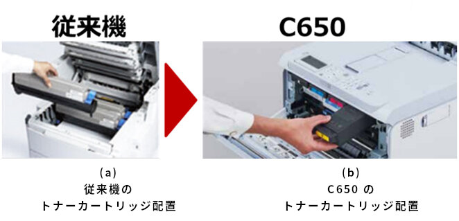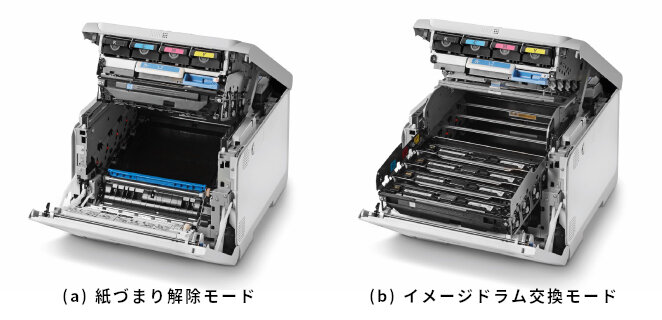 従来はトップカバーを90度以上開き装置上面からアクセスして、紙づまりの解除とイメージドラムを交換する構造であったが、メンテナンススペース削減のため、すべてのメンテナンス作業を装置前面から可能とするフルフロントアクセス化が求められた。C650では4色分のイメージドラムをバスケットに搭載し、紙づまり解除時はトップカバーを持ち上げると一緒にバスケットが持ち上がる構造とし、装置前面から作業できるようにした写真1(a)。また、イメージドラム交換時は手前にバスケットを引き出して作業できる構造とした写真1(b)。このデュアルモーションドラムバスケットシステムによって、フルフロントアクセス化を実現した。