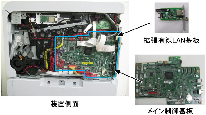 SpaceSavingTechnology以外でも基板の高密度設計と機構設計との連携により小型化をはかっている。従来、独立していた両面印刷制御基板とメイン制御基板を一体化することに加え、メイン制御基板と新規に開発した拡張有線LAN基板を装置側面の狭小スペースに収納した(図3)。
