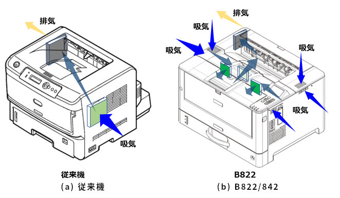 上述の小型化と高速化を両立するために冷却機構を従来から大きく刷新した。従来方式では外装カバー近くに吸気ファンを設置し、外気を内部に送り込む図5(a)が、小型化された隙間の無い構造ではイメージドラムを十分に冷やすことができない。また、被冷却部へ向けてエアダクト構造を構成するのも難しい。そこで、吸気ファンをイメージドラムと定着器とLEDヘッドの間にある僅かなデッドスペースに配置し、イメージドラムを直接冷却する機構を採用した図5(b)。さらに、エアルートの障害となるLEDヘッドのフレームもダクトの一部として機能する構造とした。また、内部に吸気ファンを配置したことで外気を取り込む能力が低下するため、装置の左右及び上部の僅かな間隙をもダクトとして利用し補う構造とした。