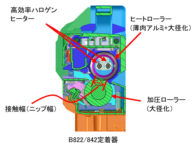従来機のローラー方式の定着器構成はヒートローラーの芯金に鉄を採用しているため、熱容量が大きく、国際エネルギースタープログラムVer.3.0の達成が困難であった。また、低熱容量化を達成する方策としてベルト方式を用いる技術があるが、要素部材のコストが上がってしまう問題があった。上記問題に対して、ヒートローラーの芯金に薄肉アルミ芯金を採用することで低熱容量化を図り、標準消費電力(TEC値)の低減を実現した。また、ヒートローラー内部にあるハロゲンヒーターを従来機に対して高効率タイプに変更することで熱応答性を高め、ウォーミングアップ時間の短縮を実現した。