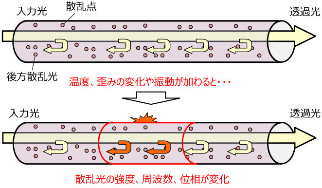 光ファイバーの片端から光パルスを入射したときに発生する後方散乱光の一つである「レイリー散乱光」を受光して、光ファイバーに伝わった振動を計測する方式。