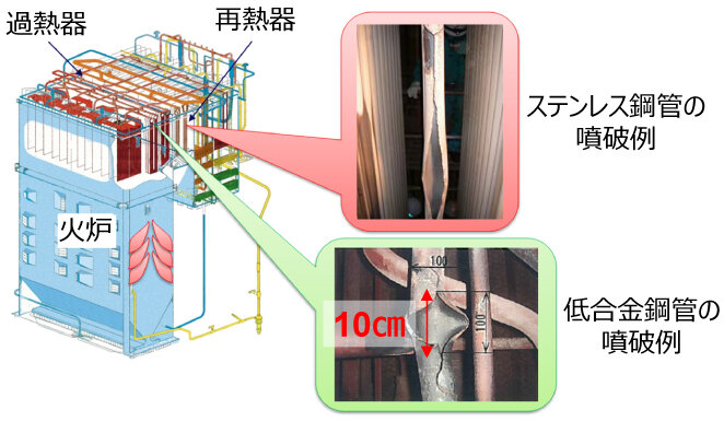 日本のCO2排出量のうち電力由来が占める割合は約4割と最も多く、2050年にかけて現在の石炭火力から太陽光や風力発電のような再生可能エネルギー及び水素やアンモニアを燃料としたCO2を排出しないゼロエミッション火力へ移行する予定である(参考文献4)。この時、火力発電は再生可能エネルギーの出力変動を補償するための調整運用(負荷追従運転)が主な役割となる。また、火力発電自体の効率化も進められ、先進超々臨界圧発電(A-USC)(参考文献5)という方法で蒸気温度の高温化(700℃級)による発電効率の10%向上、CO2排出量10%削減が取り組まれている。しかし、このような超高温設備の出力調整運用の長期安定運用の実績はなく、さまざまな課題が挙げられている。例えば、蒸気温度700℃級のボイラーでは、伝熱管の表面温度が常時750℃に達し、燃焼が不安定になると局部的に加熱される領域(ホットスポット)が生じ、図2に示すような破断が起きてしまう。そのため、設備故障による計画外停止、事故のリスクやエネルギーロスを回避するために、伝熱管表面の温度分布や「き裂」を監視するシステムが求められている。