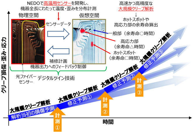 本取組みは、NEDO(国立研究開発法人 新エネルギー・産業技術総合開発機構)の先導研究プログラムで実施した内容であり、我々は超高温設備に適した仕様として空間分解能10cm、測定距離500m、測定時間1秒の性能をもつ光ファイバー温度・歪みセンサーをSDH-BOTDR方式により実現した(参考文献6)。また、光ファイバーセンサーで取得したデータから歪みが時間とともに増加するクリープ現象を高速かつ大規模に解析し(大規模クリープ解析)、デジタルツイン技術を利用したリアルタイムな異常検知と余寿命を把握するオンライン監視システムを構築することができる(図3)。