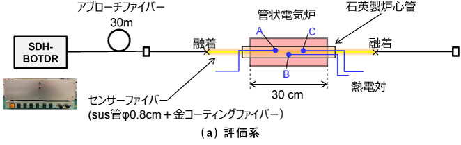 超高温設備を模擬した光ファイバーセンサーの評価として、図4(a)に示すような管状電気炉を使用した超高温試験を実施した。超高温対応の光ファイバーには、0.8mmφのSUS管に挿入された金コーティングファイバーを使用し、電気炉内の正確な温度分布は炉内中央に5cm間隔で3本の熱電対を設置して測定した。