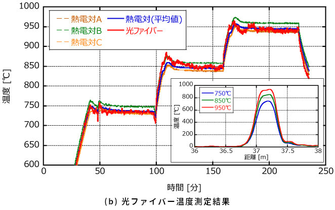 電気炉の温度を750℃から最大950℃まで変化させた時の温度測定結果を図4(b)に示す。約30cmの電気炉内の温度変化の分布が正確に測定でき、ホットスポットを特定できることが確認できた。また時系列変化では、若干のバラつきが見られるものの熱電対の測定範囲内でよく一致した結果が得られた。熱電対平均値と光ファイバーの温度誤差は最大で5℃となり、JIS C1602K基準熱電対クラス2(±5.6℃以下)と同等の性能で測定できることを実証した。