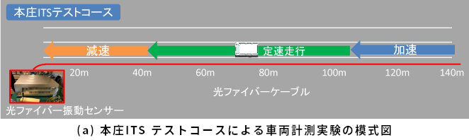 光ファイバー振動センサーによる交通流計測の検証実験として、OKI本庄工場の敷地内にある本庄ITSテストコースで実施した車両計測結果を紹介する。図6(a)に本庄ITSテストコースでの車両計測実験の概略を示す。本実験では、テストコースの車線脇に約200mの光ファイバーを直置きし、横の車線を車両で走行することで、車両振動の計測を試みた。図6(b)に本実験の計測結果を示し、左図は1台の車両による振動計測結果を、右図は参考データとして二人が順方向に、一人が逆方向に走った際の振動を測定した結果を示している。