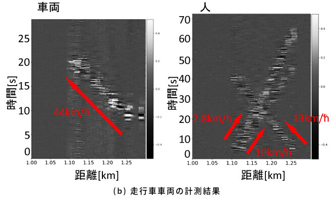 グラフの横軸は光ファイバーの入射端からの距離、縦軸は測定時間を示し、振動周波数がコントラストで表示されている。図中の矢印で示すように、グラフ上の時間経過に伴う振動の軌跡を視認することができ、傾きから移動速度を特定できる。計測結果より車両では44km/h、人物では7.8~13km/hと算出でき、車両だけでなく人が走る際に発生する微弱な振動までも計測できることを確認できた。今後、AI分析により交通量だけでなく事故や逆走などの事象検知を目指していく。