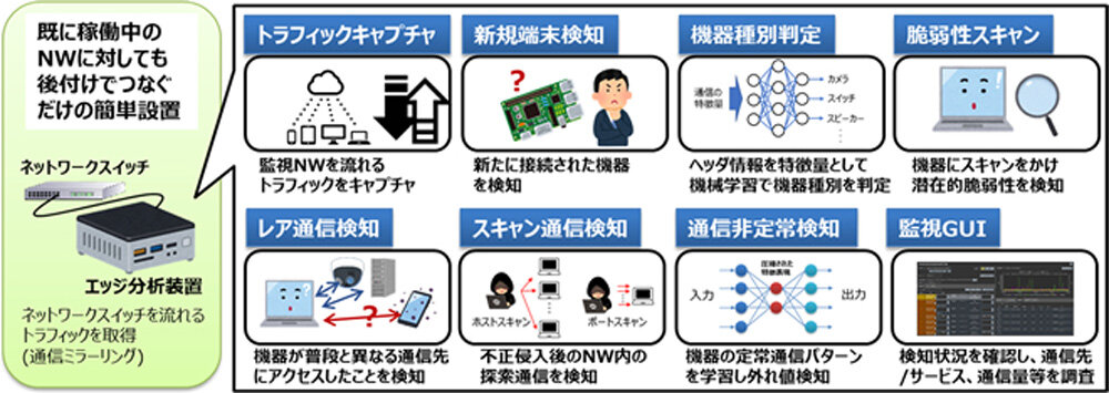 またOKIは、本技術に加え、平常時の通信状態から逸脱した挙動を検知する「通信非定常検知機能」や、ネットワーク内の機器の設定不備や安易なID/パスワードを検知する「脆弱性スキャン機能」、ネットワーク内の機器接続や通信トラフィックを可視化し管理者に通知する「監視GUI(Graphical User Interface)」などを搭載した「リアルタイムネットワーク監視システム」を開発しました。