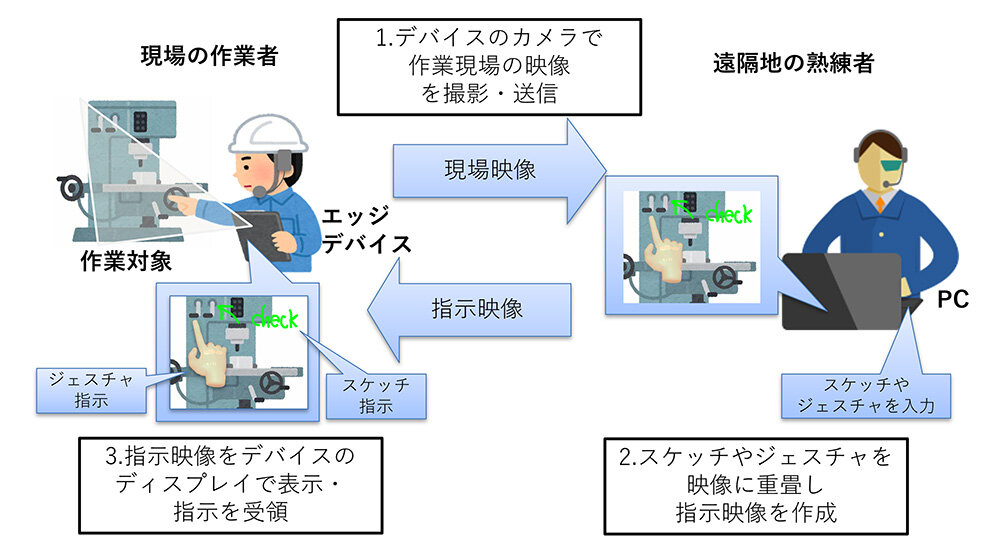 本システムは、熟練者と現場作業者間の相談や指示を、熟練者が現地に赴かず実施できるように開発したもので、スマートフォンなどのエッジデバイスを活用して、リアルタイムな現場作業支援を可能とします。通常の映像音声通信に加え、現地を撮影した映像を遠隔地の熟練者に送付し、熟練者側でスケッチやジェスチャーなどの作業指示内容を重ねて、作業者側に指示を映像として送付することができます。また、標準技術WebRTC(注2)を用いているため、一般的なウェブブラウザを搭載した多くのデバイスで利用することが可能です。