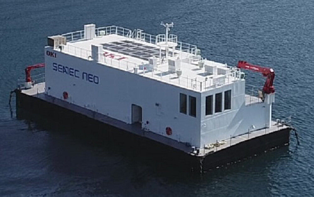OKIは、国内唯一の固定式海上試験施設を33年ぶりにリニューアルし、新固定式計測バージ(注1)「SEATEC NEO」として稼働を開始しました。「SEATEC NEO」は静岡県沼津市の内浦湾内に固定され、実際の機器使用環境に近い海中でセンサーやソーナー、AUV(自律型潜水調査機器)など、さまざまな海中用機器の評価機材の海上試験を行います。従来の施設より評価機材を吊り下げる開口部面積を1.5倍に大型化し、さまざまな用途・大きさの海中用機器の海上試験を可能としたほか、屋上に設置したソーラーパネルで施設内に電力を蓄電し、昼夜を問わず海上の気象データなどを取得・蓄積することが可能となりました。