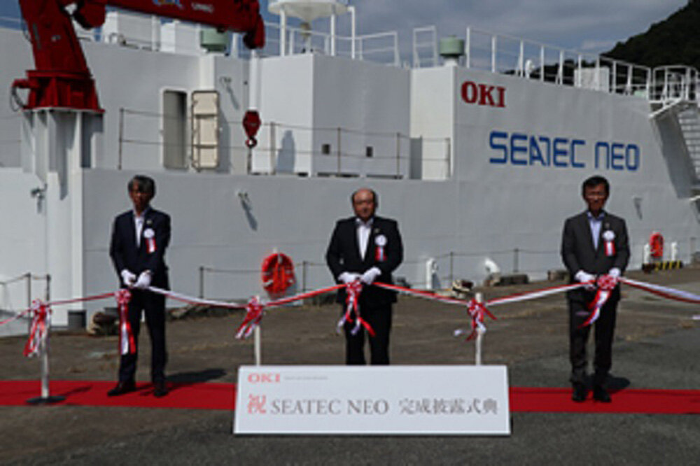 稼働開始に先立ち、9月28日、29日には漁協・関連会社、およびメディアを招待した完成披露会を実施しました。披露会では「SEATEC NEO」の安全祈願に続き加藤上席執行役員とOCE大塚社長が挨拶に立ち、漁協などの皆さんに日ごろの協力への感謝と今後の協力関係継続のお願いをお伝えしました。また森社長は取材に訪れた報道機関に対し、OKIの成長戦略の一つである海洋事業に積極的に取り組んでいくことを説明し、地元紙などさまざまな媒体で取り上げられました。
